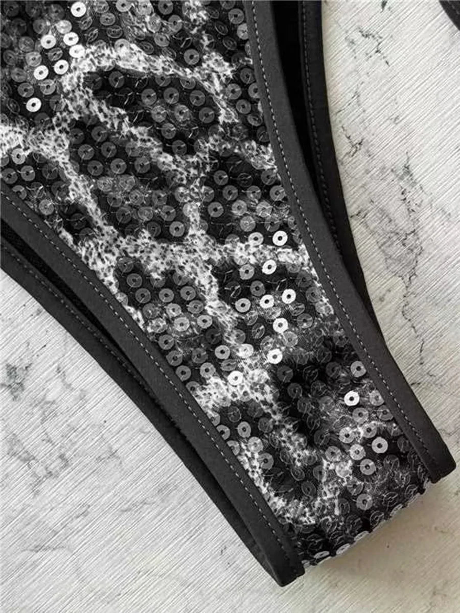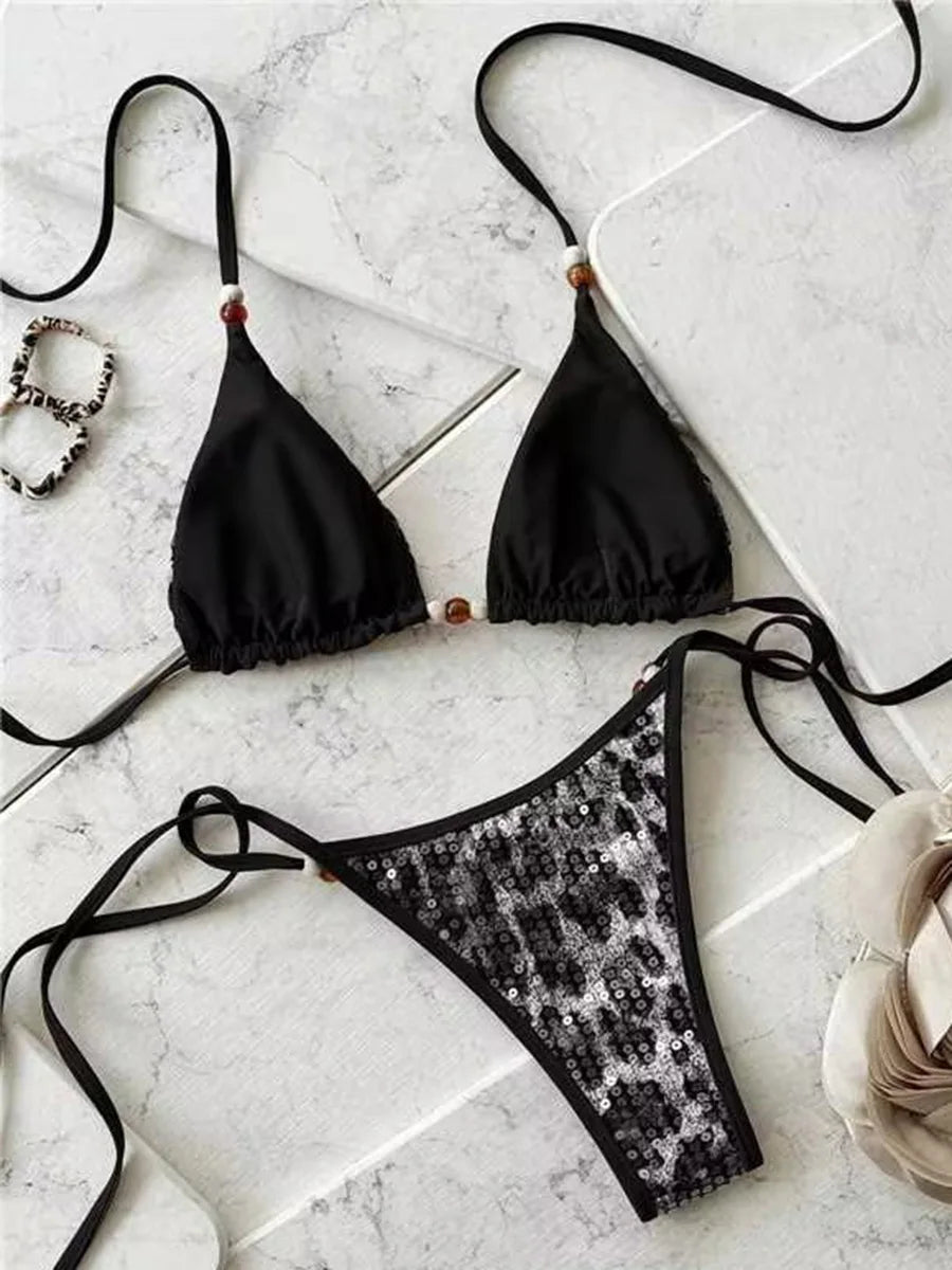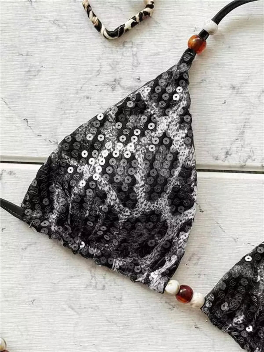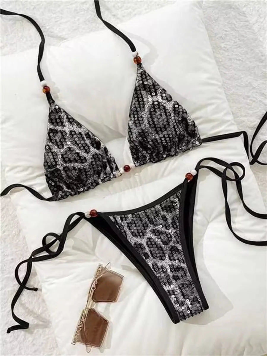 ביקיני שני חלקים בהדפס מנומר עם קשירה בצוואר למראה קייצי ובולט.