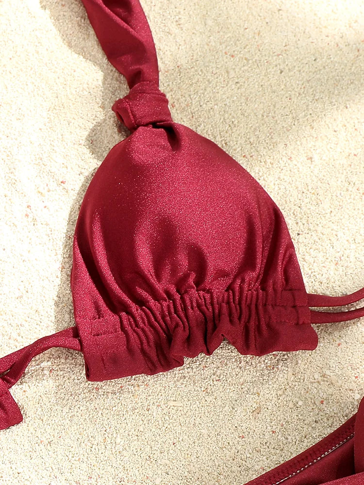 בגד ים דו-חלקי בגזרה משולשת ונוצצת, עשוי מבד פוליאסטר וספנדקס איכותי בגימור מבריק שמושך את העין בדיוק במידה הנכונה. הקשירה בצדדים מאפשרת התאמה מושלמת לגוף, והתמיכה ללא ברזלים שומרת על נוחות מקסימלית גם לאורך כל יום בים או בבריכה.
