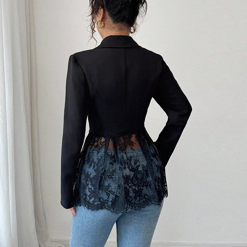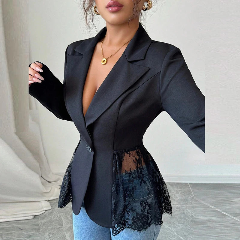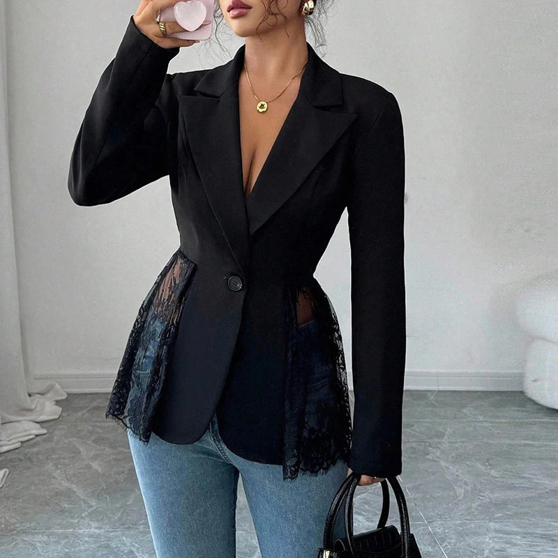 ז׳קט מחויט עם סגירת כפתור אחת ועיטורי תחרה עדינים למראה נשי ומוקפד.