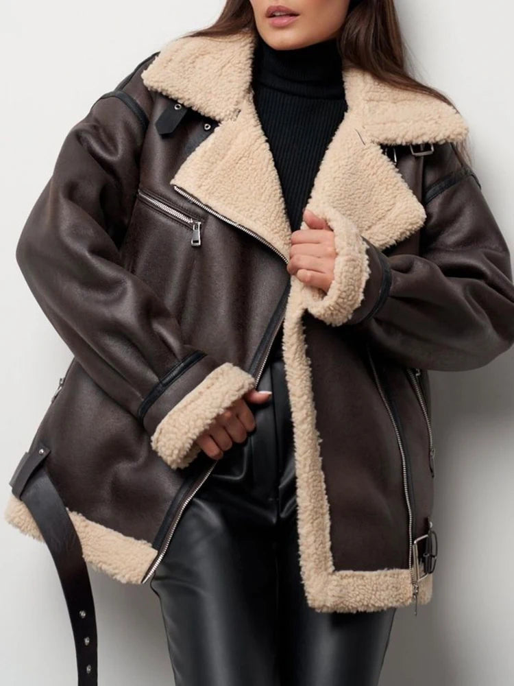 ז׳קט דמוי עור בעיצוב אורבני עם צווארון קלאסי ורוכסנים דקורטיביים למראה מודרני ובעל נוכחות.