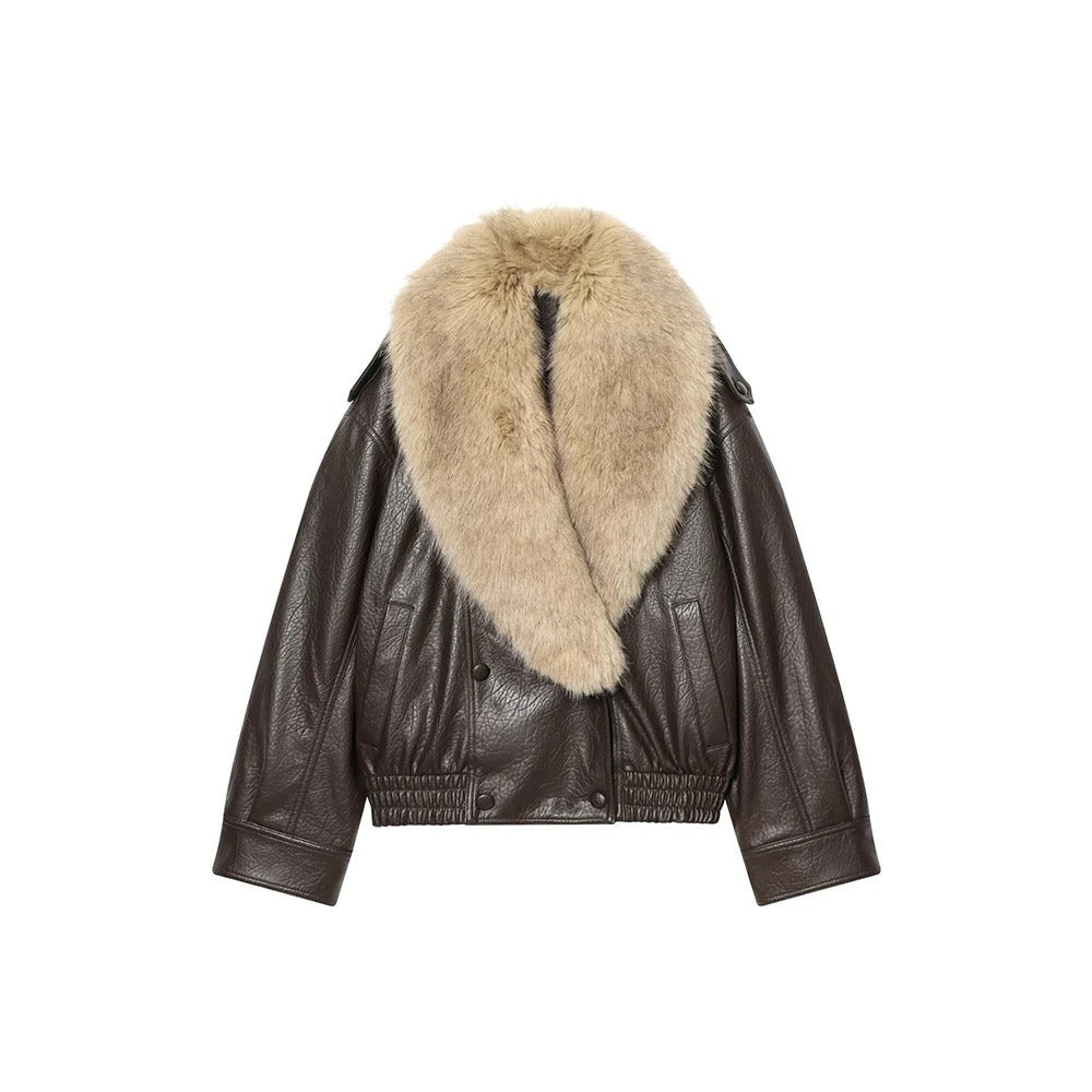 ג'קט פרווה בעיצוב קלאסי עם סגירת כפתורים כפולה וצווארון מתקפל למראה מוקפד ונינוח.
