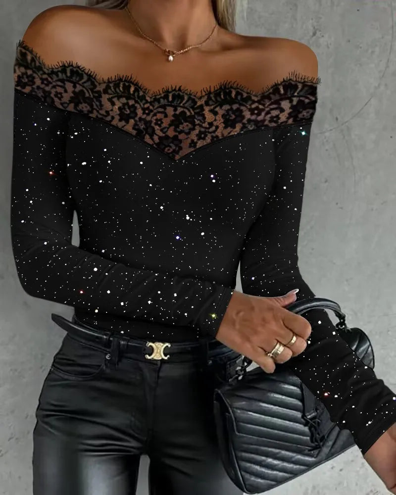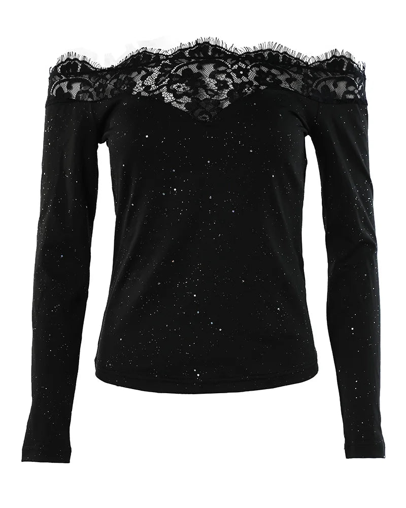 חולצה בגזרה מחטבת עם מפתח אלכסוני ופרטי תחרה שמוסיפים עומק ועניין למראה.