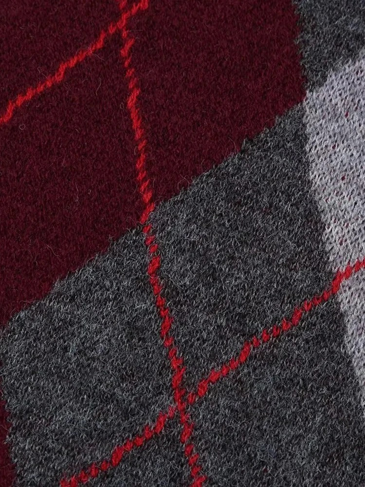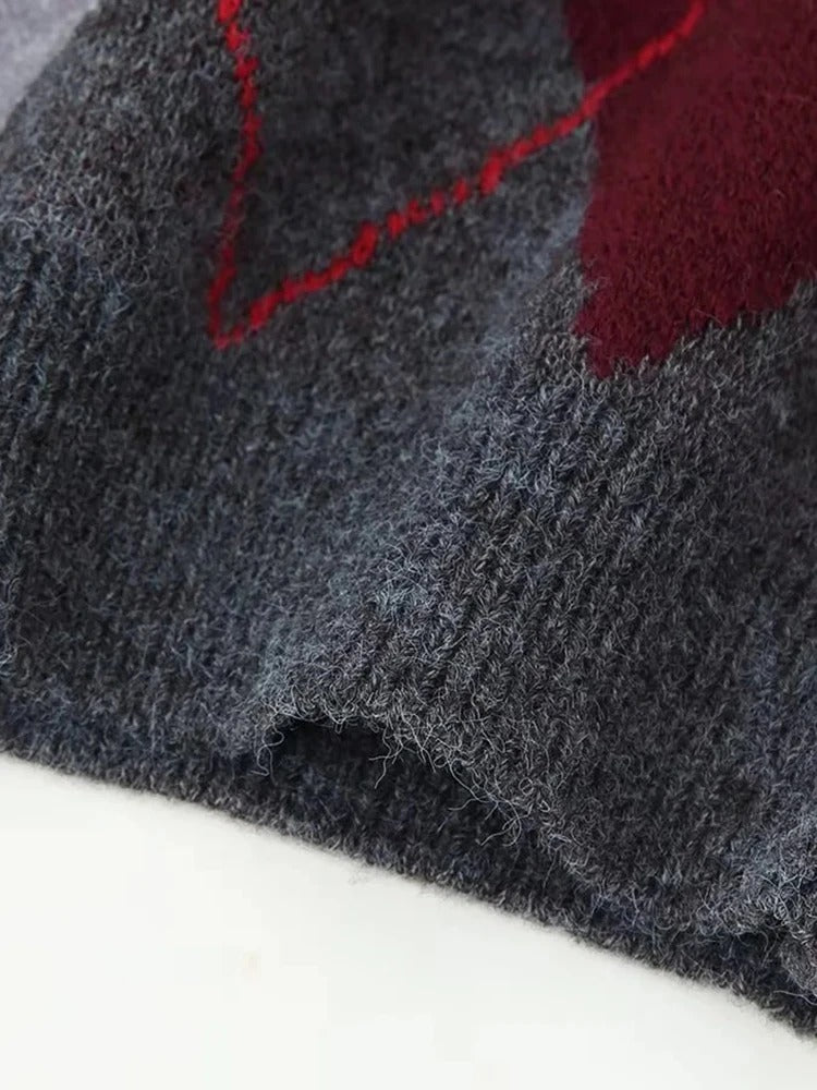 סוודר בגזרה רחבה עם צווארון עגול ודוגמת יהלומים בסגנון וינטג’י.