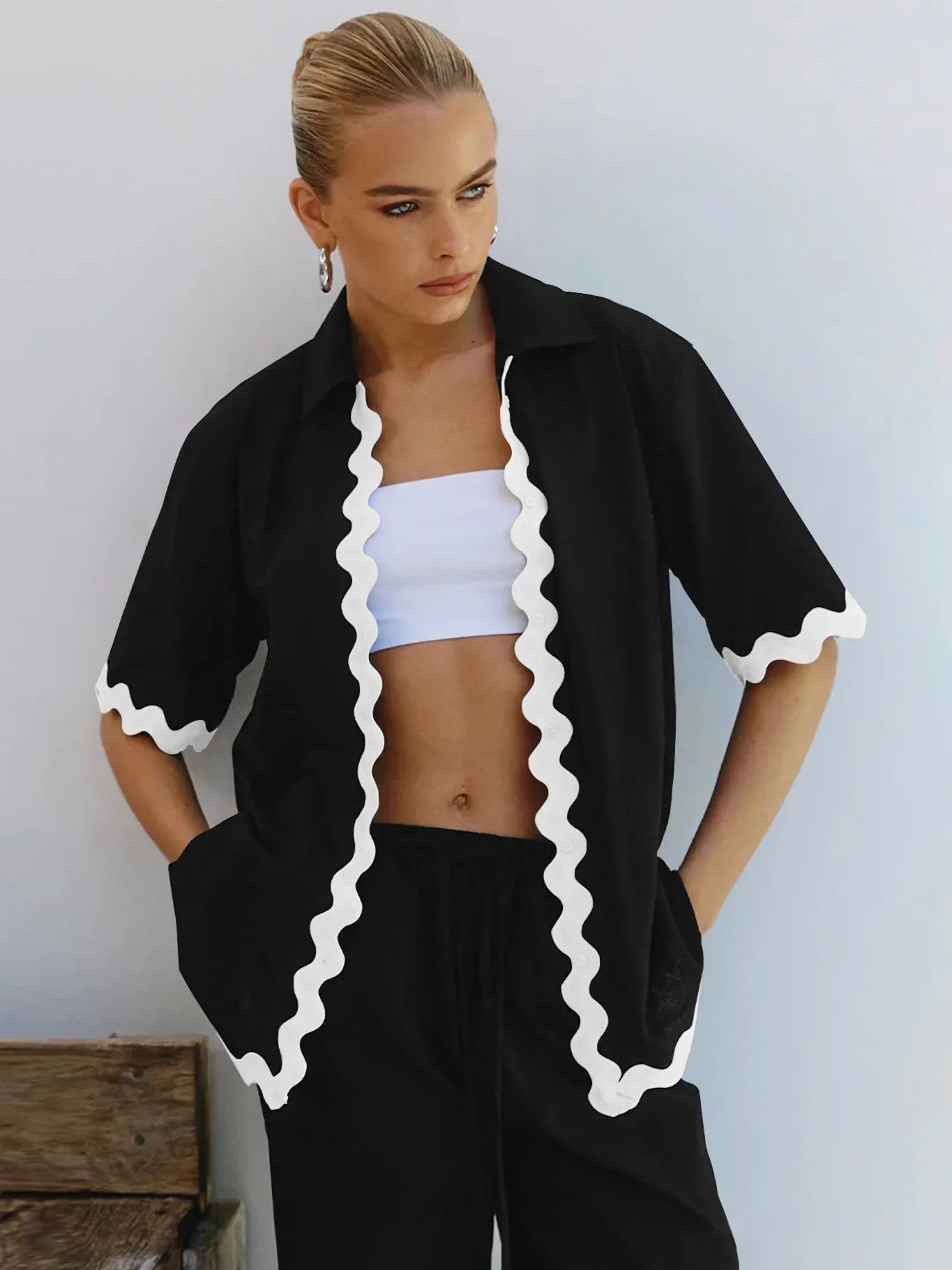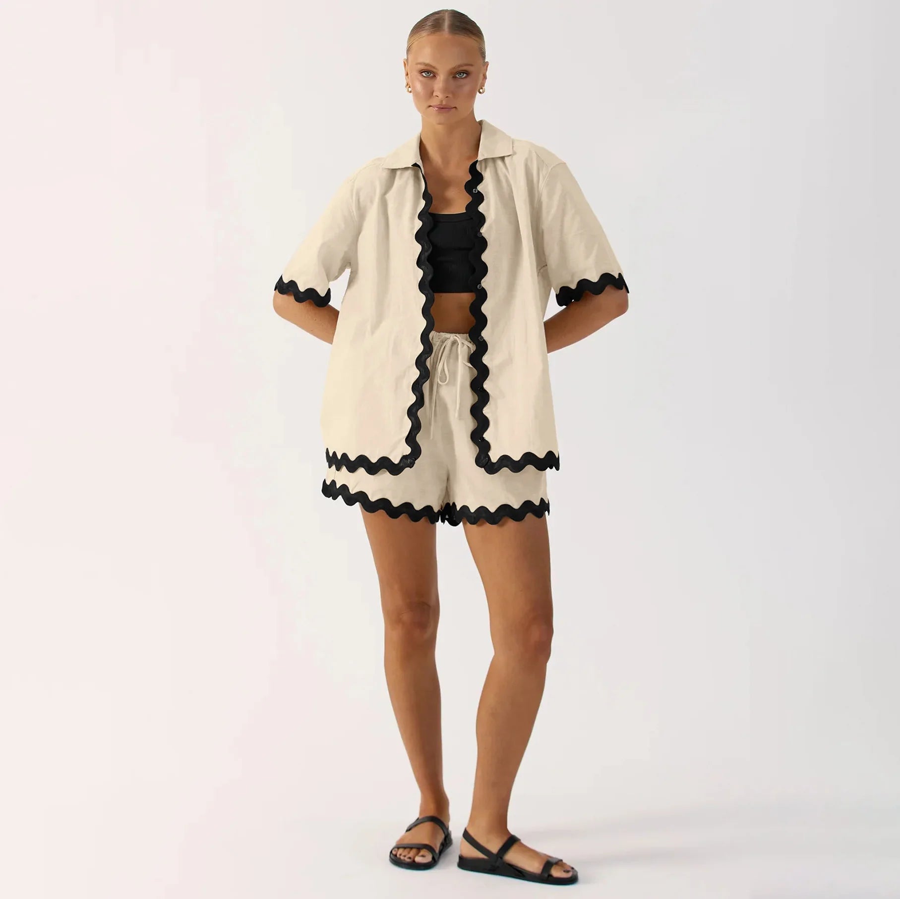 סט קייצי בשיק מהמם וקליל. חולצה בגזרה מדויקת ונוחה, עם מכנסיים קצרים מחמיאים – בול לימים חמים וללוק מושלם.