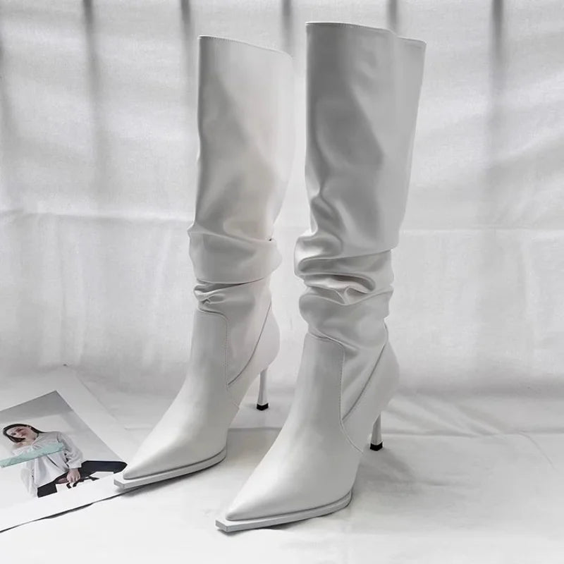 מגפיים גבוהים עד הברך עם חרטום מחודד ועקב דק בגובה נוח שמאריך את הרגל.