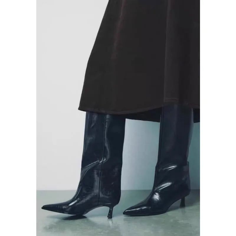 מגף נשים בגובה חצי שוק בסגנון רחוב עם חרטום מחודד ועקב דק וגבוה לנוכחות בולטת.