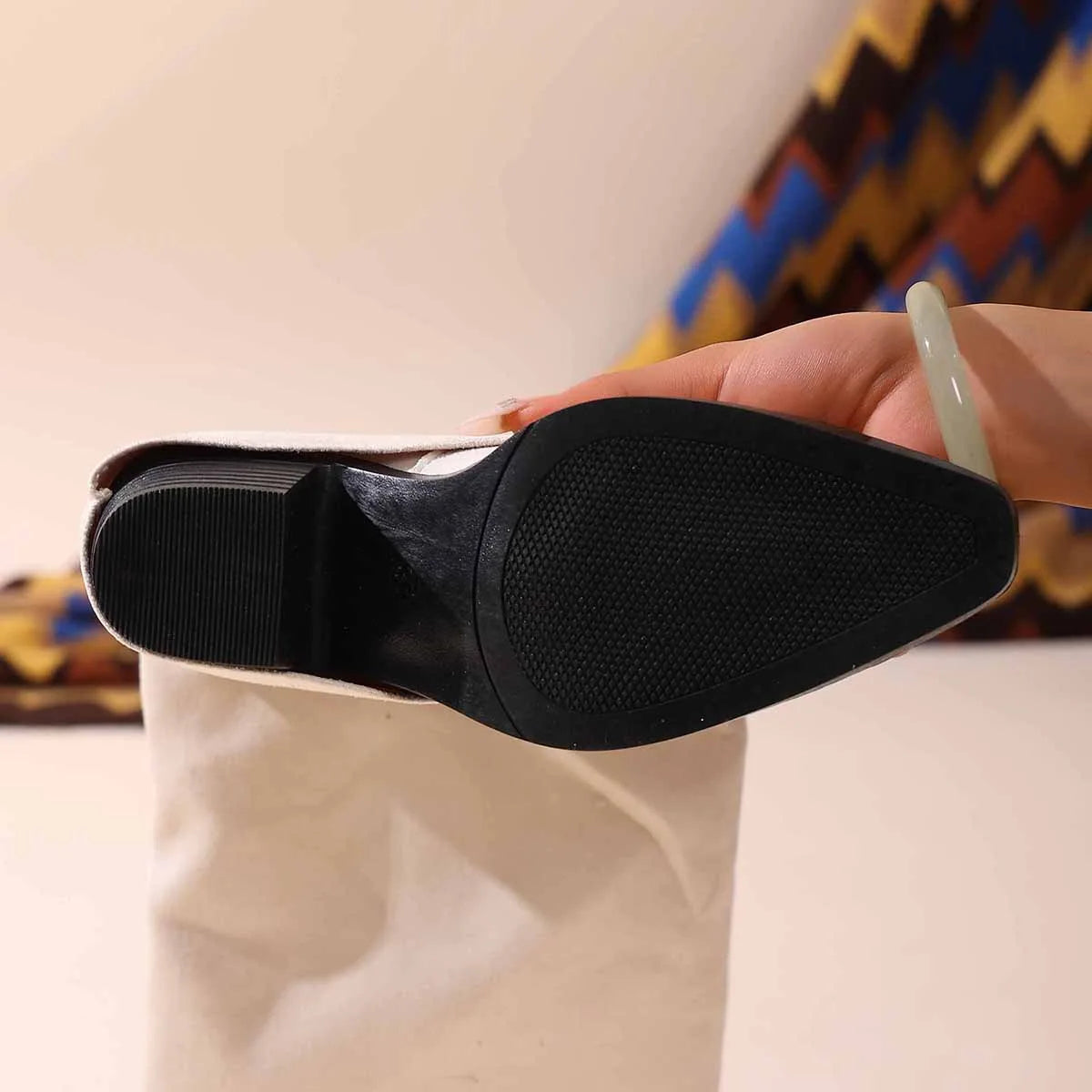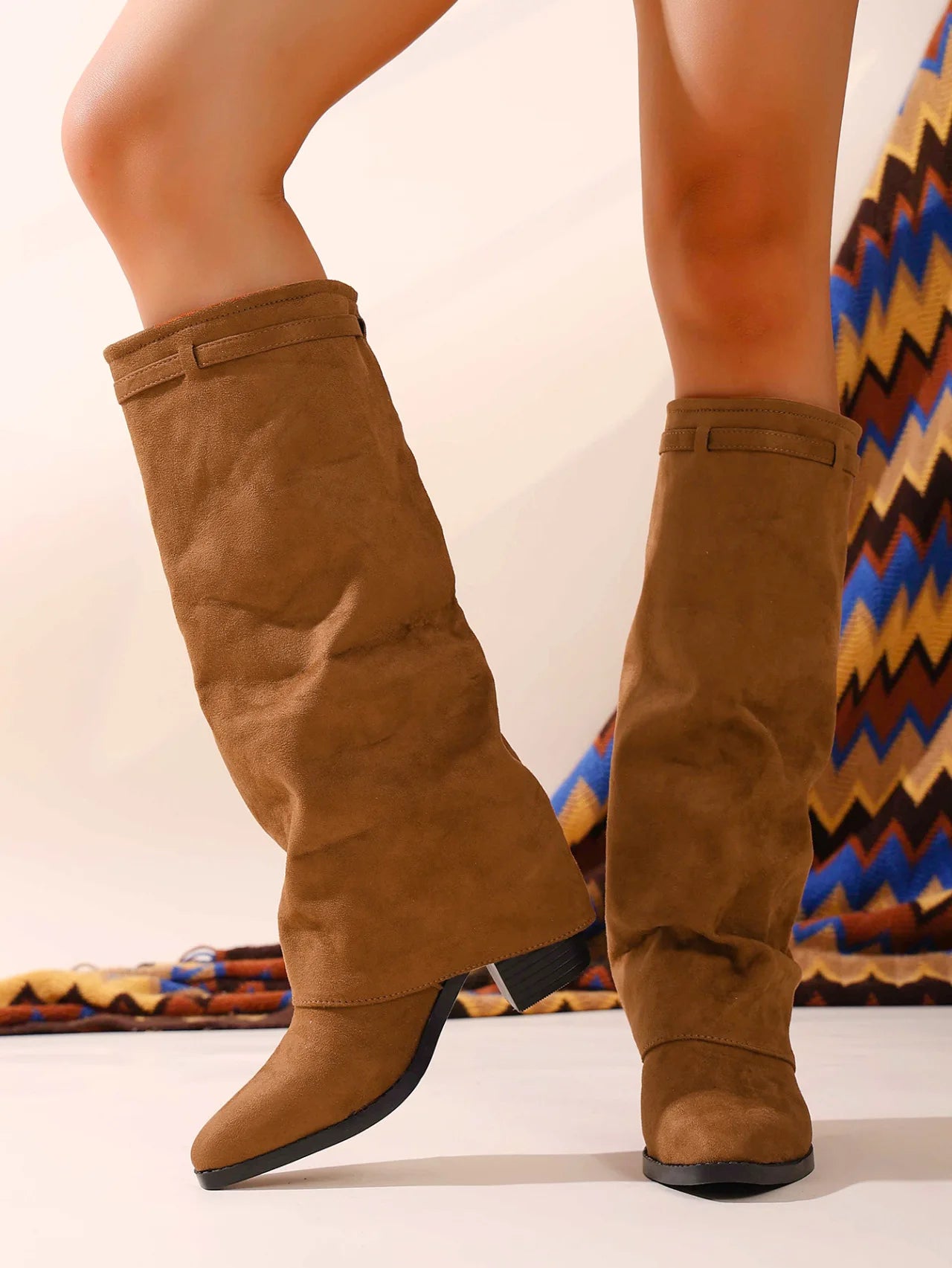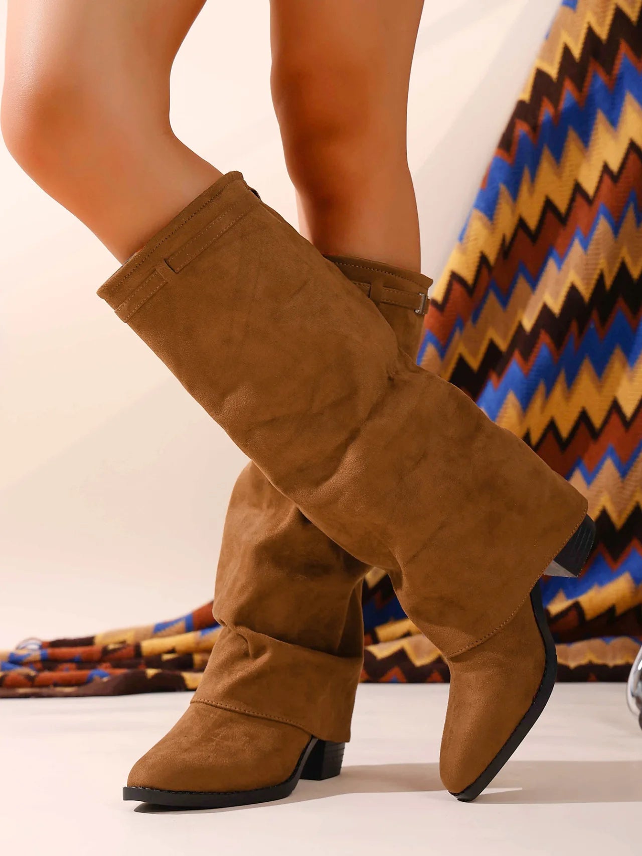 מגפיי זמש בעיצוב מינימליסטי עם חרטום מחודד ועקב מרובע למראה נקי ואלגנטי.