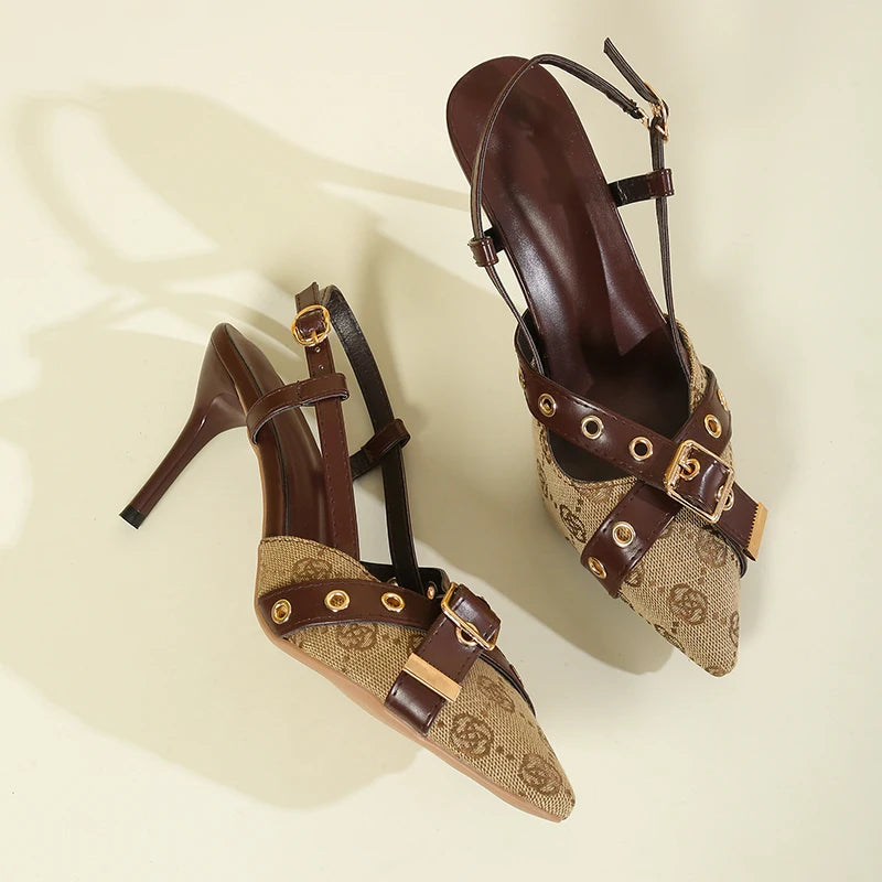 נעלי עקב עם עקב דק ורקמת בד קנבס בגווני קפה וחאקי – שילוב של אלגנטיות ונוחות. עשויים PU עם סוליית גומי ואבזם אחורי להתאמה מושלמת. משתלבים נהדר עם לוקים קיציים. שווה לבדוק.