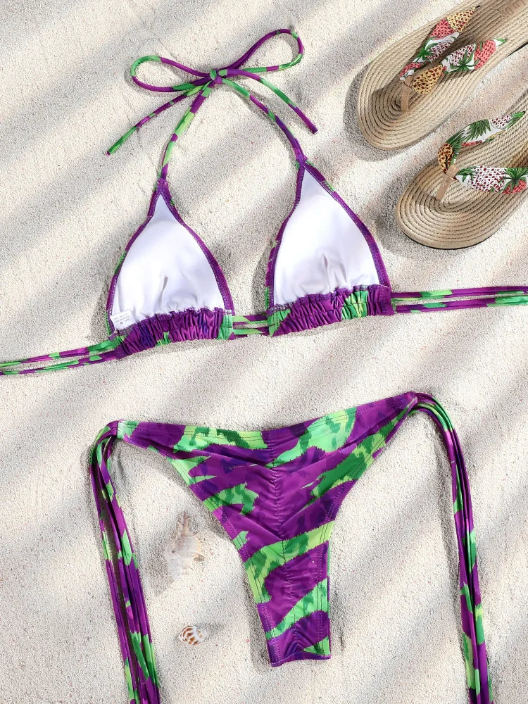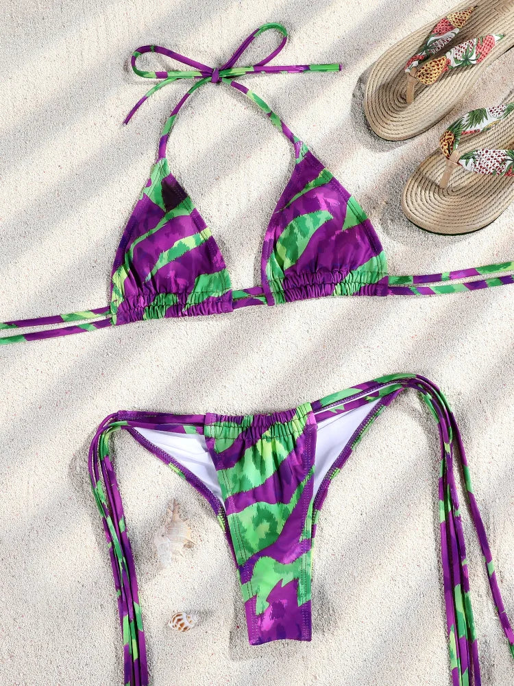 ביקיני עם הדפס נועז, מחשוף עמוק וקשירה מחמיאה שמוסיפה עניין לכל מראה. עשוי מבד נמתח ונעים למגע (פוליאסטר וספנדקס) שמתייבש במהירות. מושלם לחופשות, מסיבות בריכה או סתם יום שמשי.