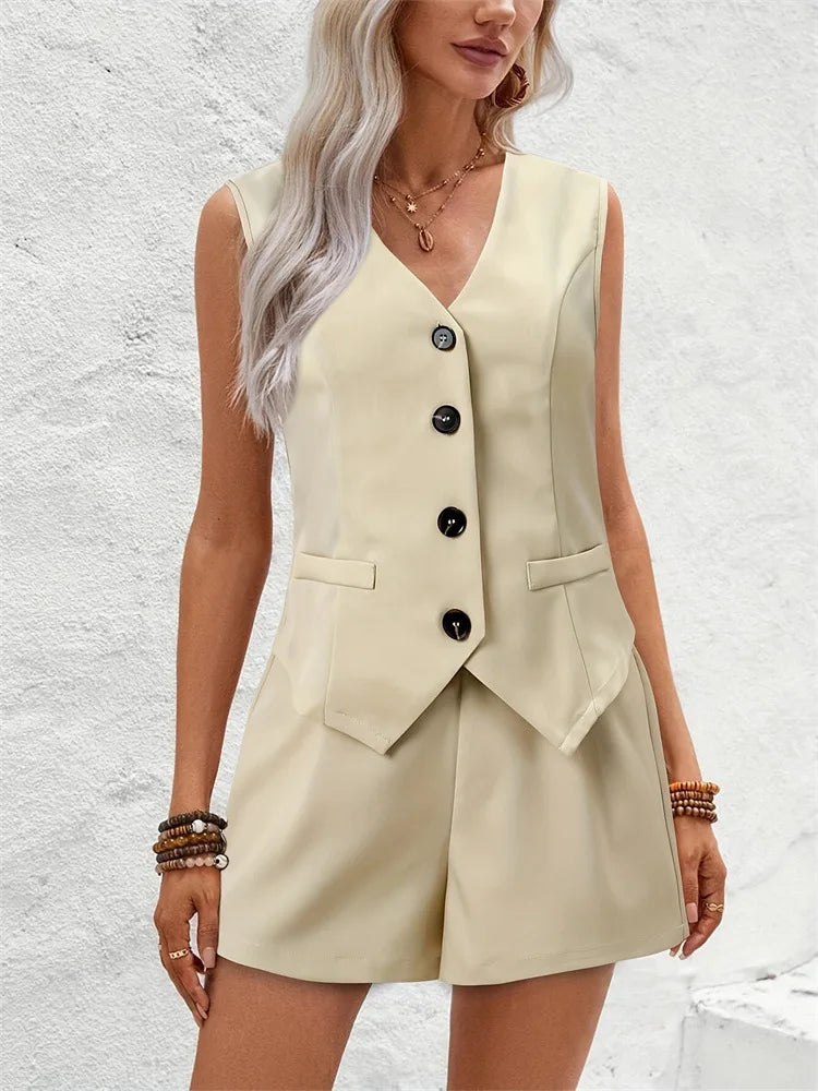 סט קיצי אלגנטי הכולל חלק עליון ללא שרוולים עם סגירת כפתורים ומכנס קצר בגזרה נקייה.