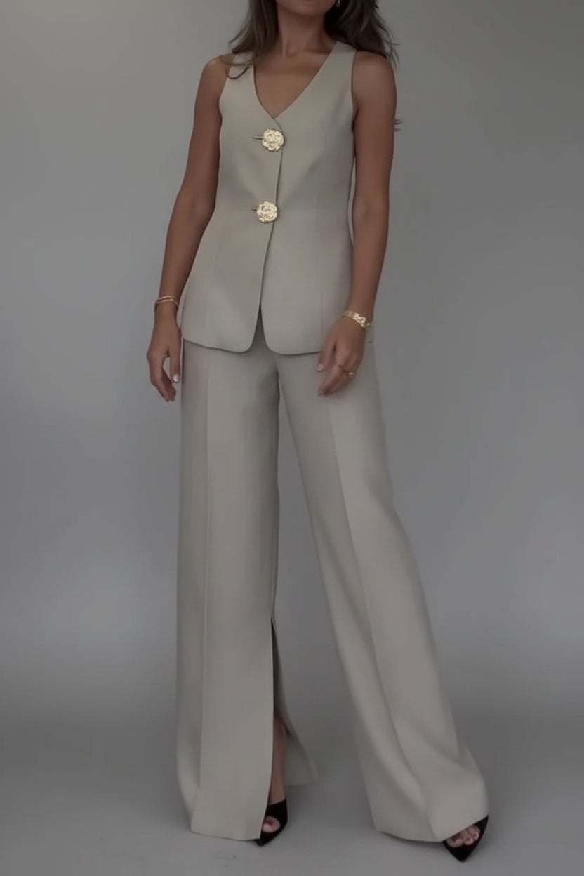 סט אלגנטי הכולל חלק עליון ללא שרוולים עם מחשוף וי וסגירת כפתורים קדמית.