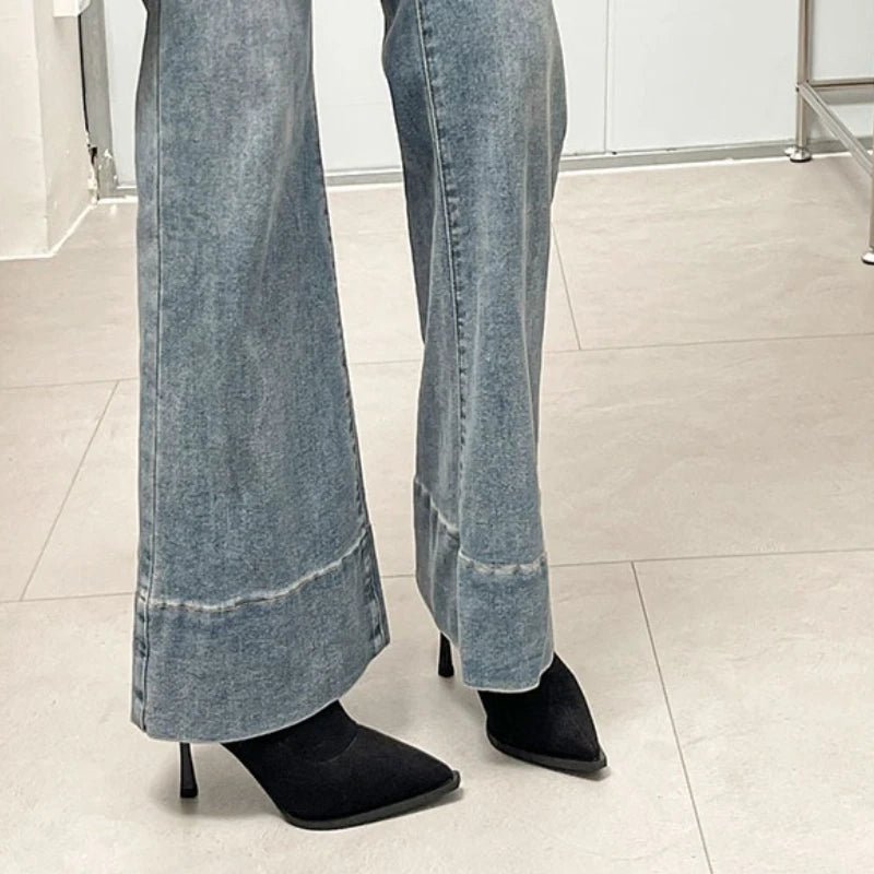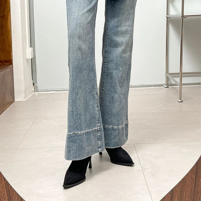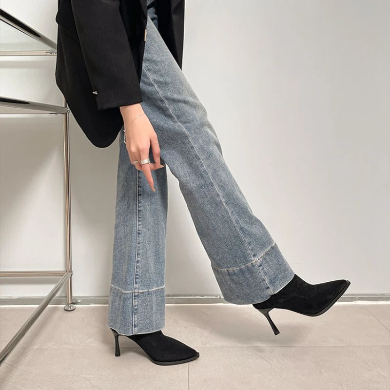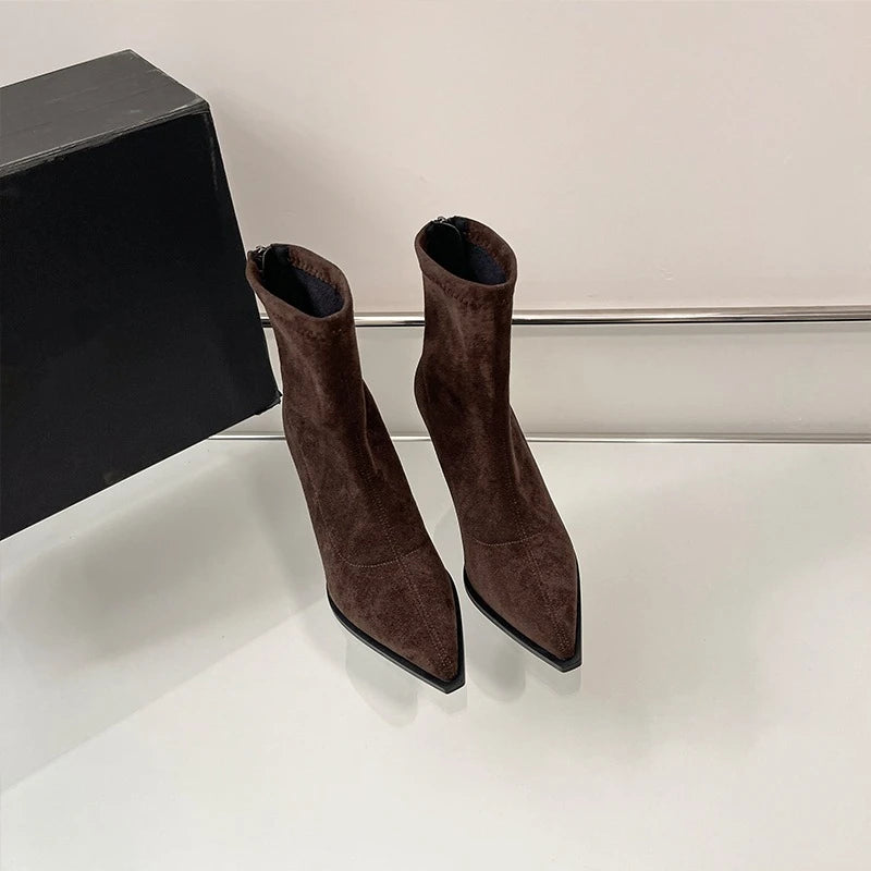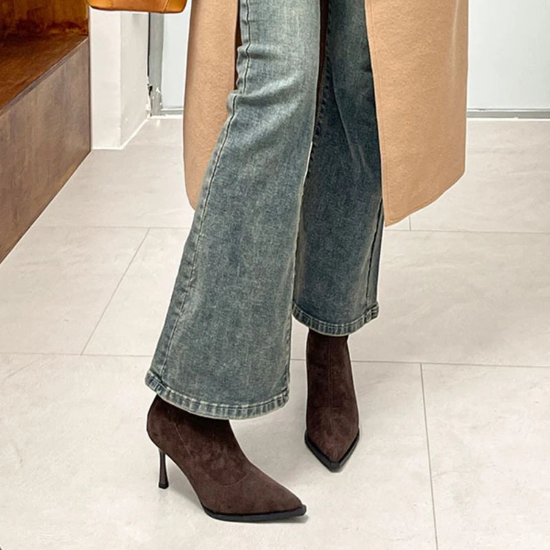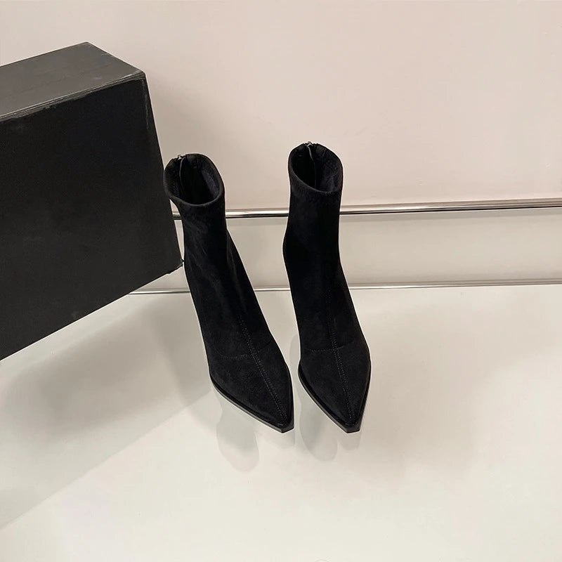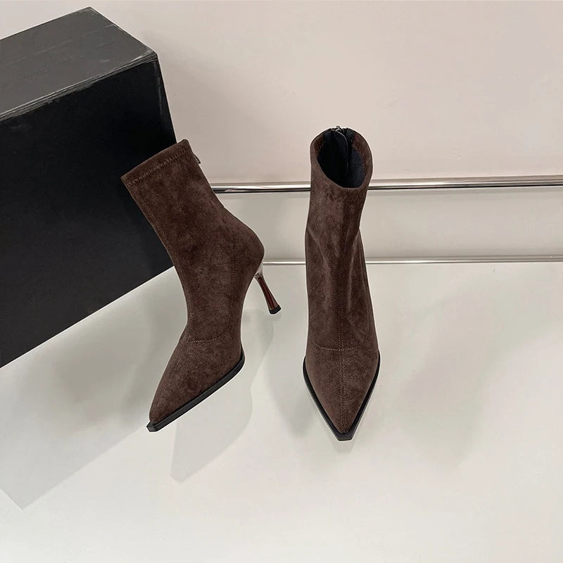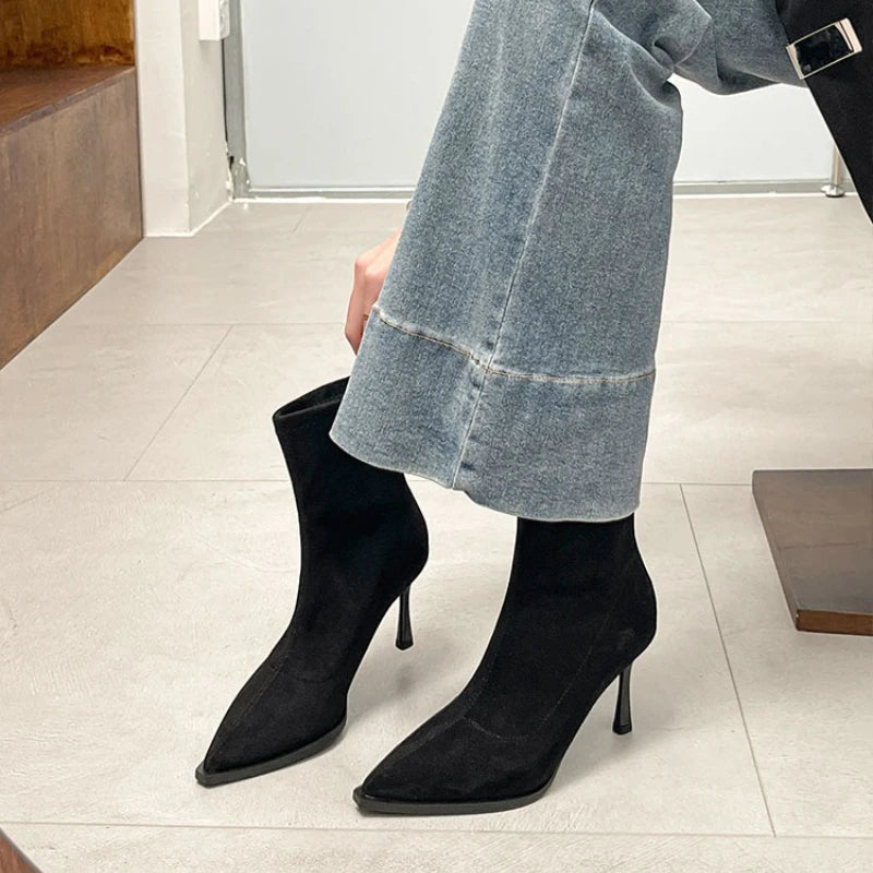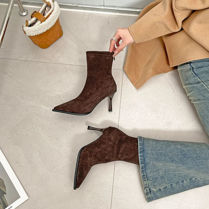 מגפוני עקב עם חרטום מחודד ועקב דק, בעיצוב מודרני שמעניק מראה נשי ומוקפד.