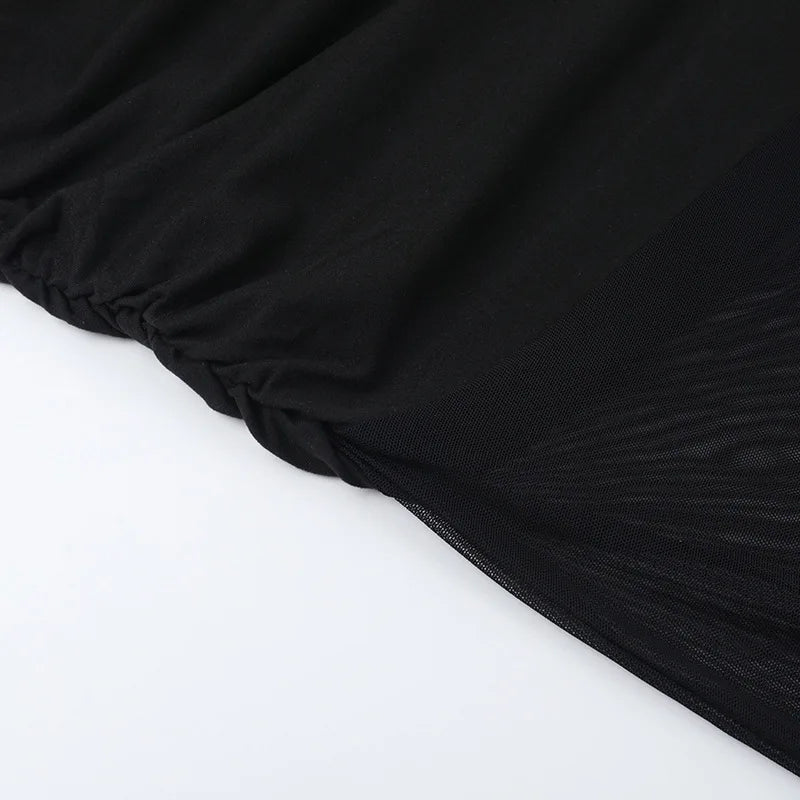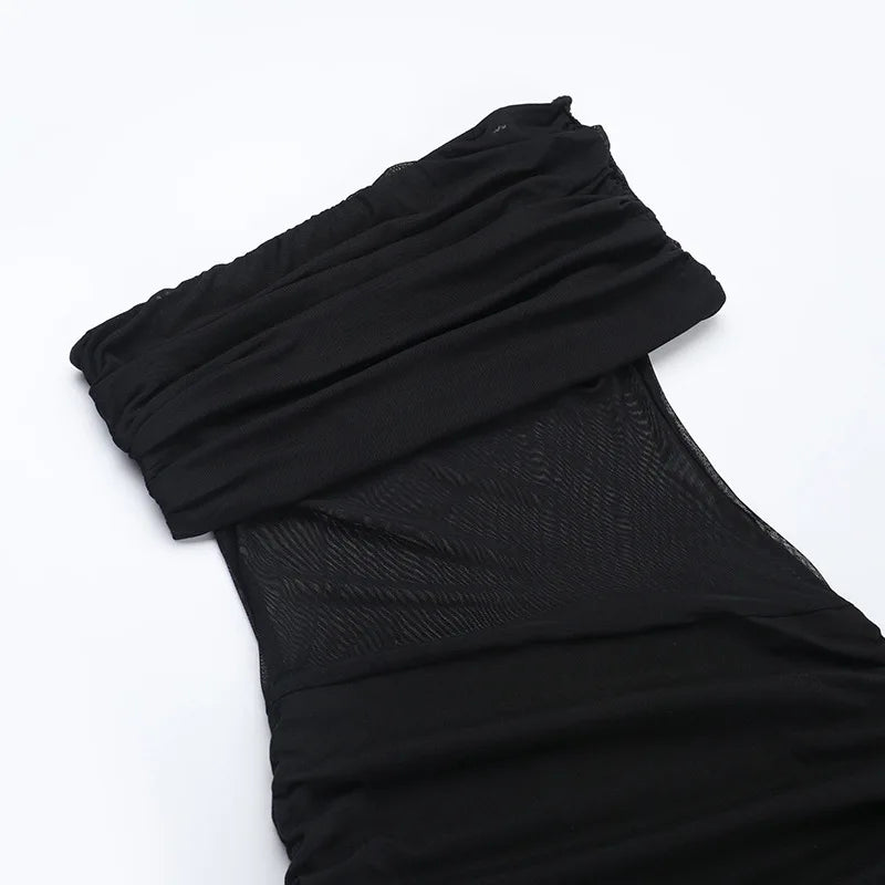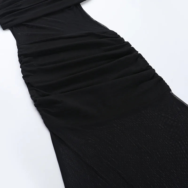 עיצוב כתף אחת עם קפלים עדינים ושילוב רשת יוצר מראה נועז ומלא תנועה.