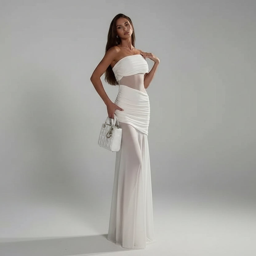 שמלת מקסי צמודה בגזרה מחמיאה עם מותן גבוהה המדגישה את הסילואטה.