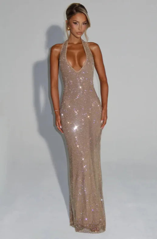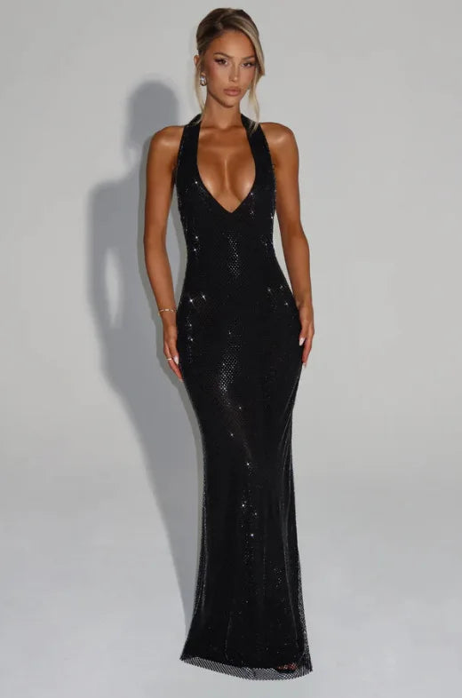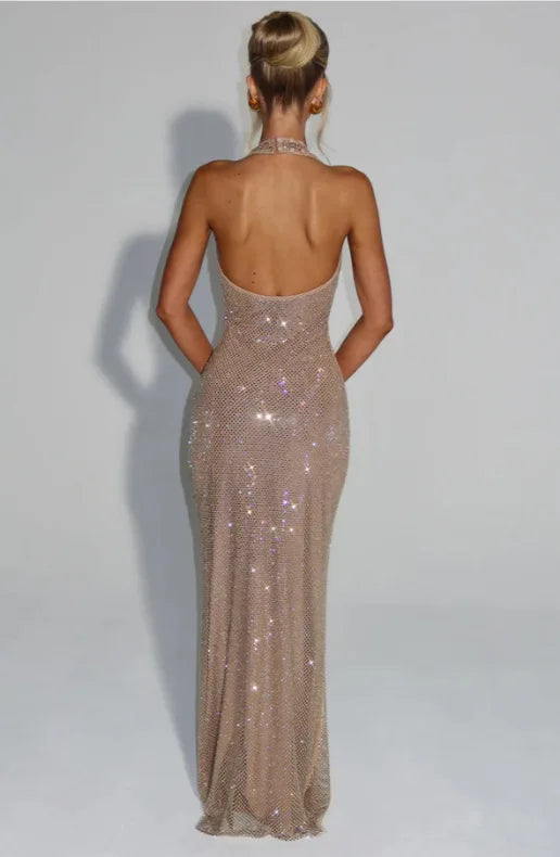 שמלה ארוכה ומרשימה עם צווארון הולטר ועיטורי פאייטים שמוסיפים ברק ויוקרה.