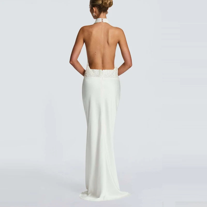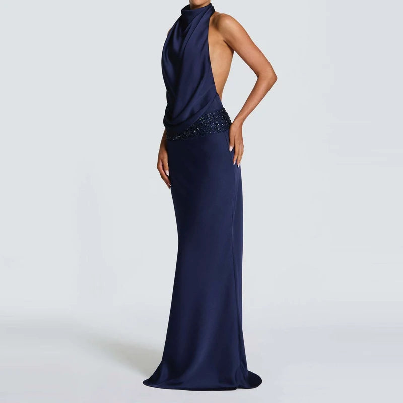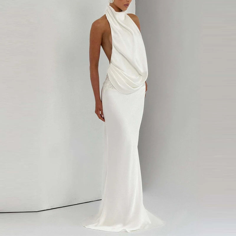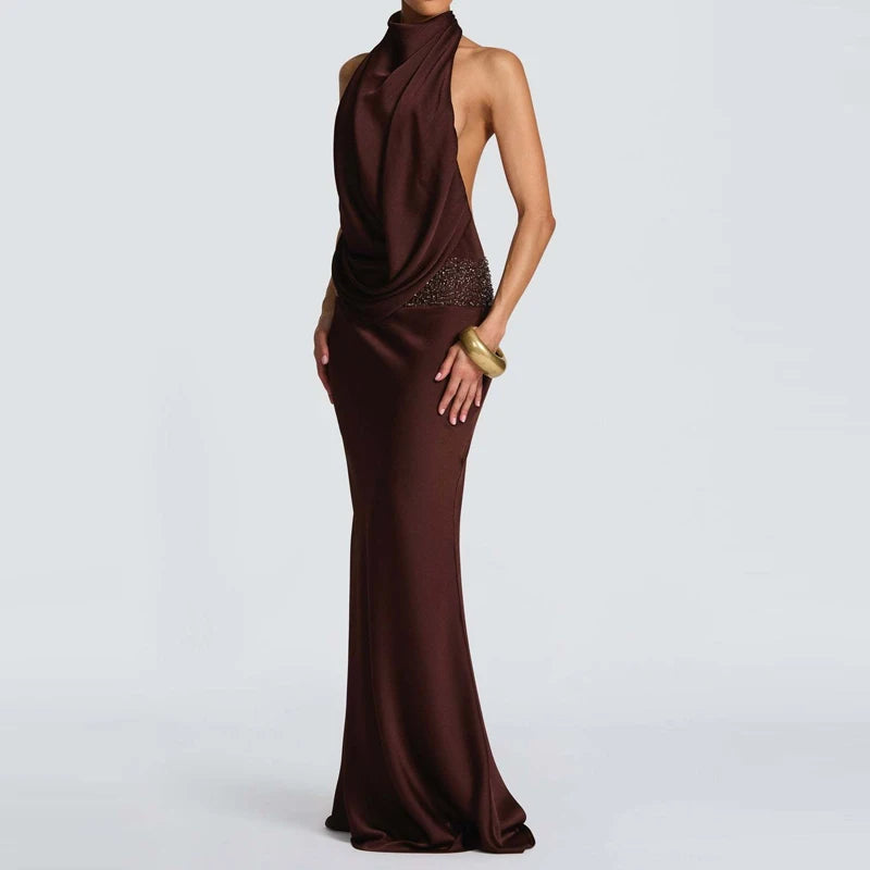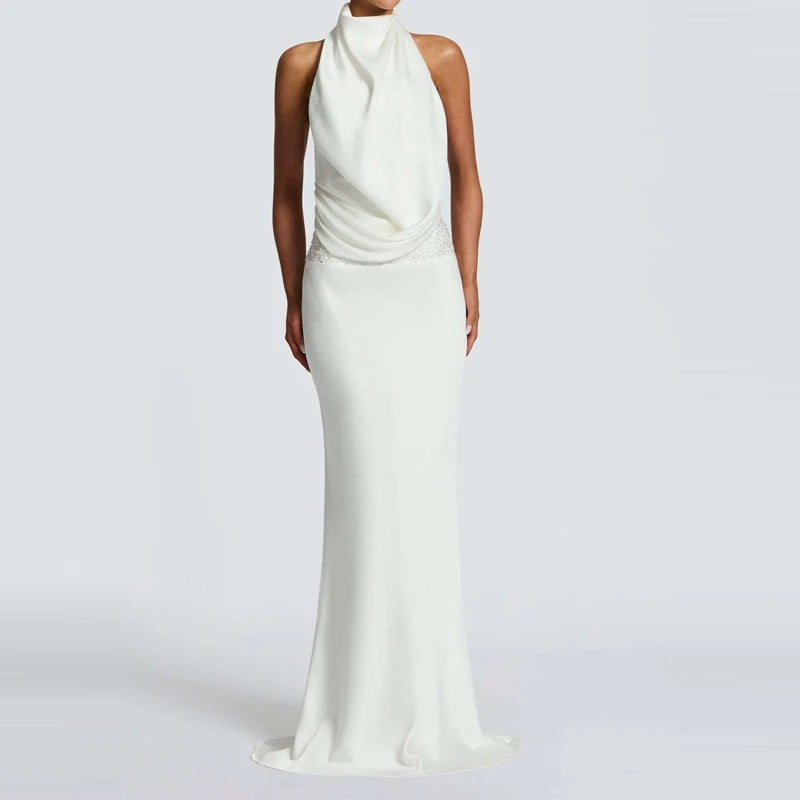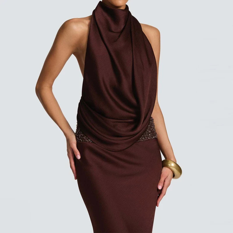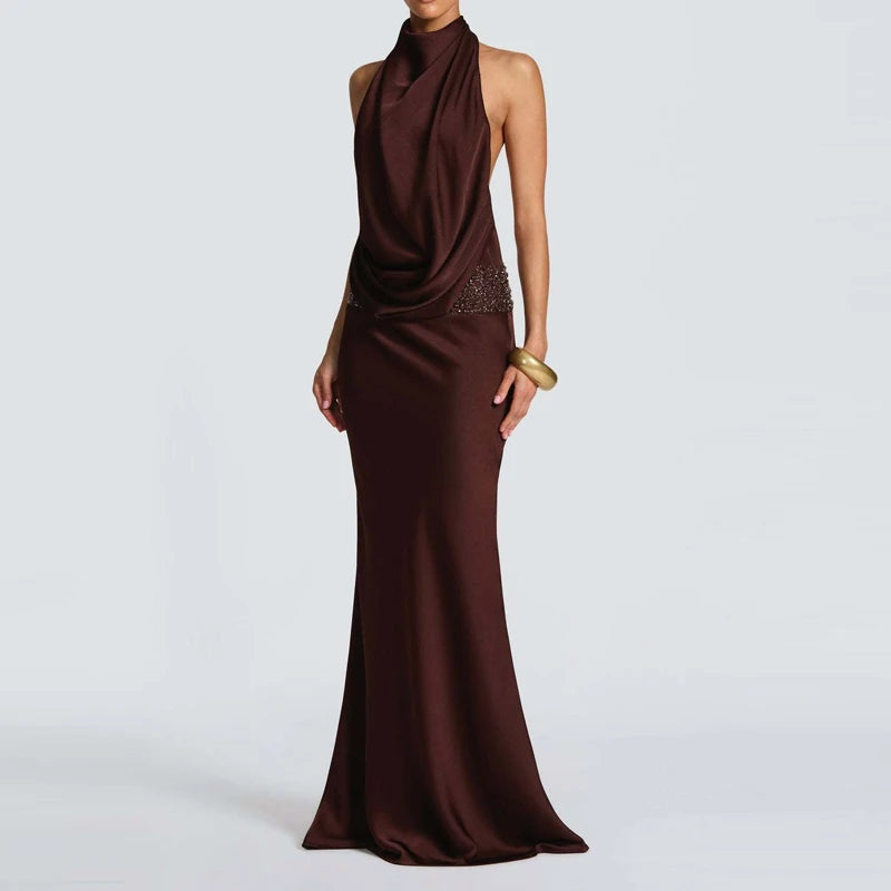 שמלה ארוכה בגזרה צמודה עם צווארון הולטר ודרפינג מחמיא שמדגיש את קווי הגוף.