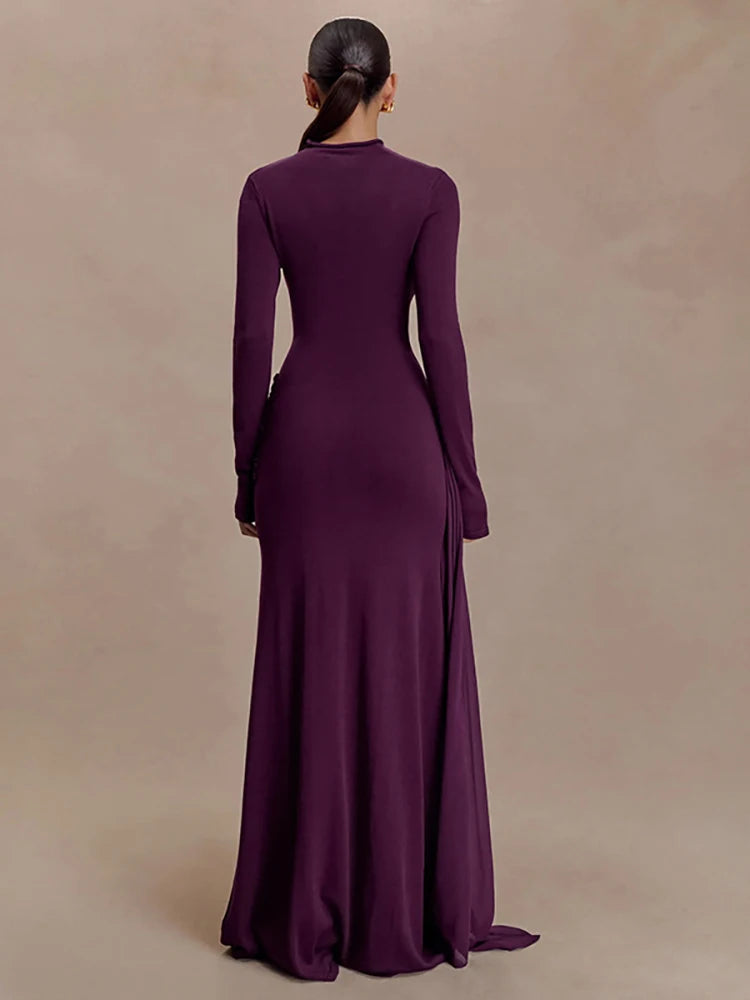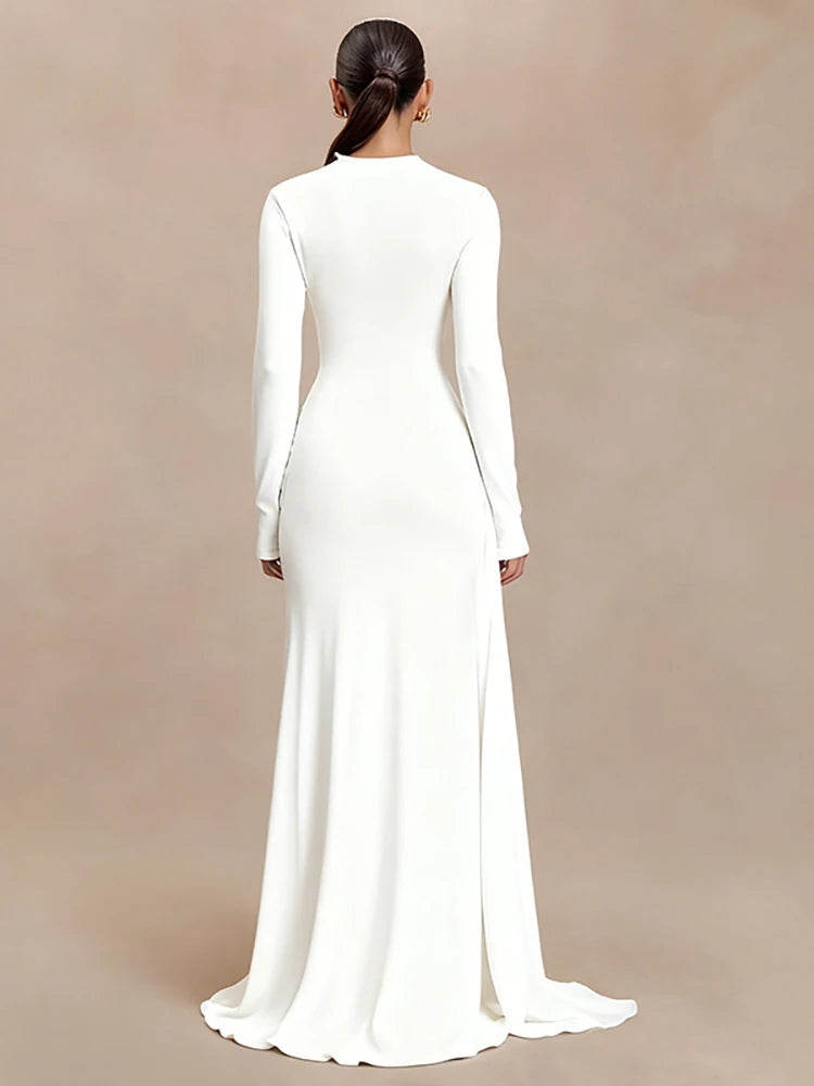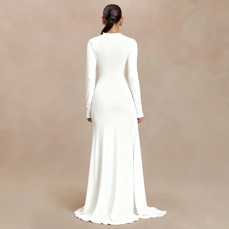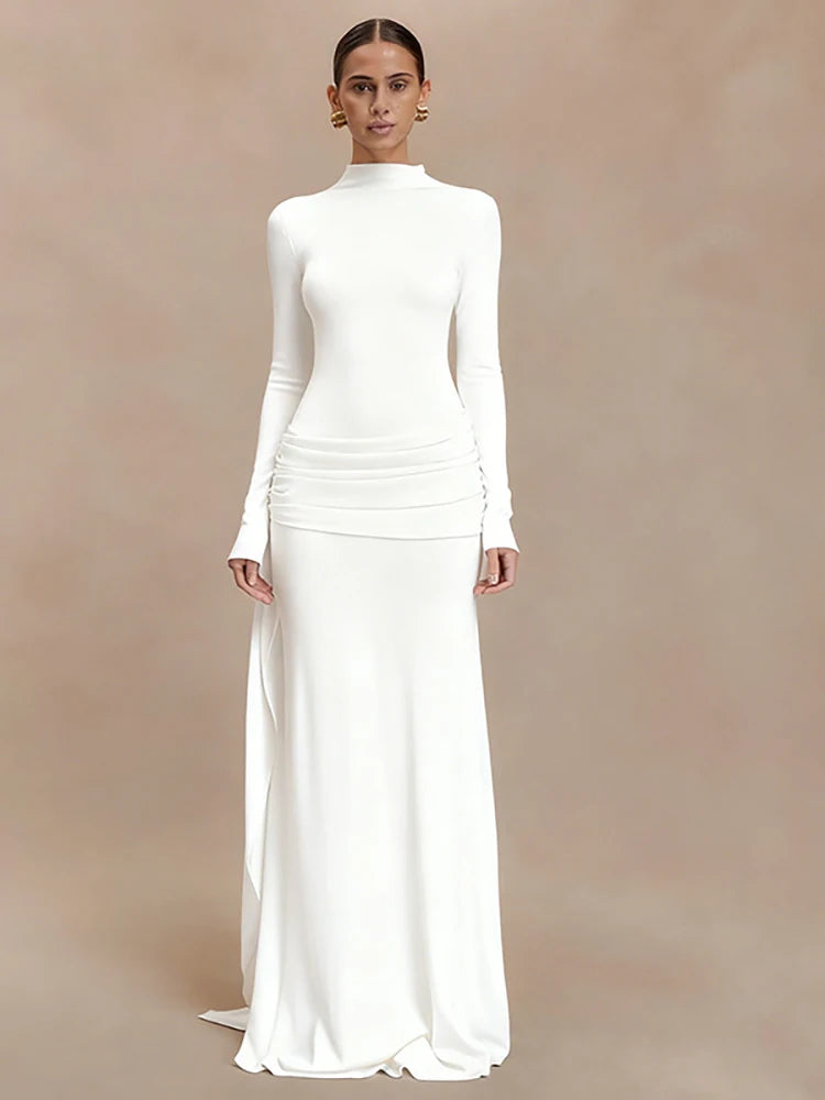 שמלה צנועה באורך מקסי עד הקרסול בגזרה צמודה המחמיאה לקווי הגוף ומדגישה את המותן הגבוהה.