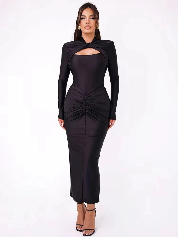 שמלה צנועה באורך הקרסול בגזרה צמודה המדגישה את קווי הגוף בצורה אלגנטית.
