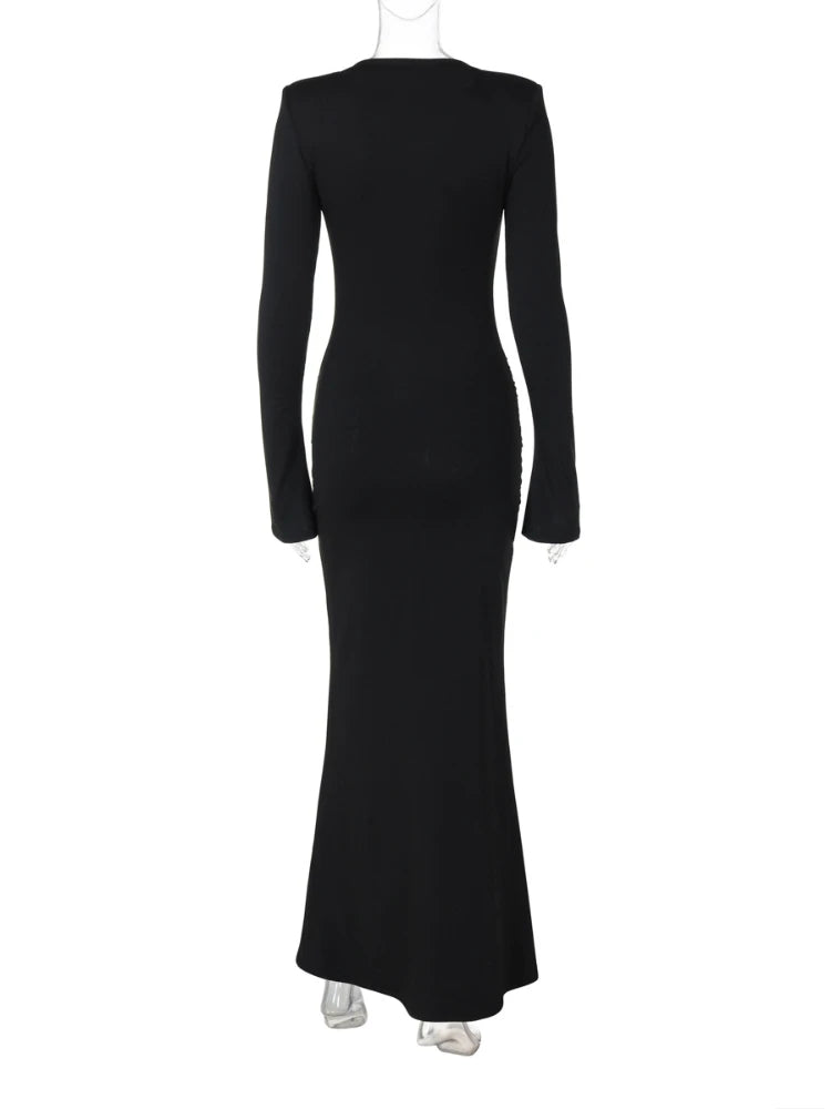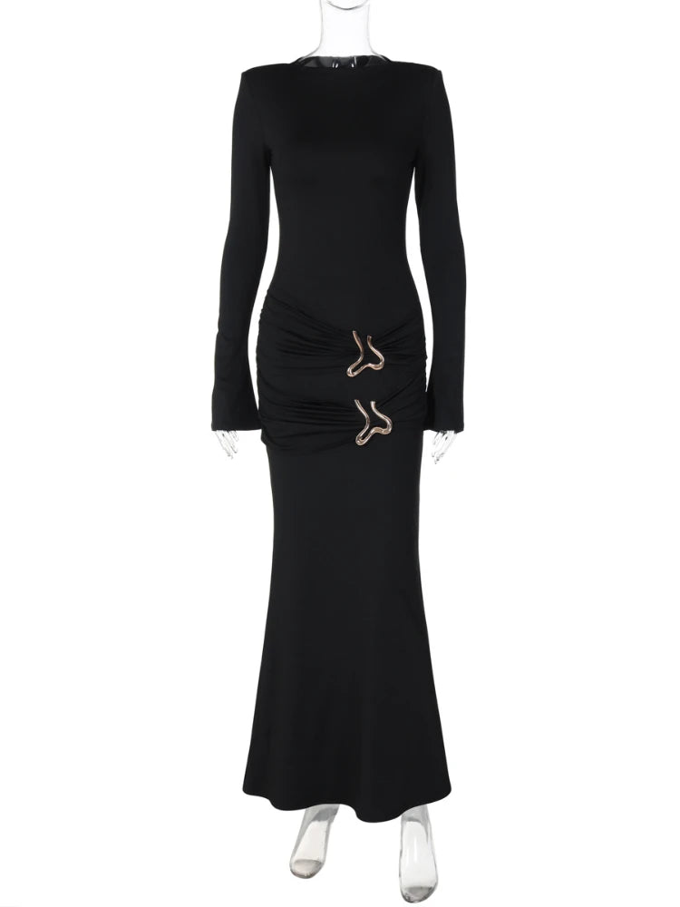 שמלת מקסי צנועה באורך מלא בגזרה ישרה ומחמיאה, המדגישה את קווי הגוף בצורה אלגנטית.