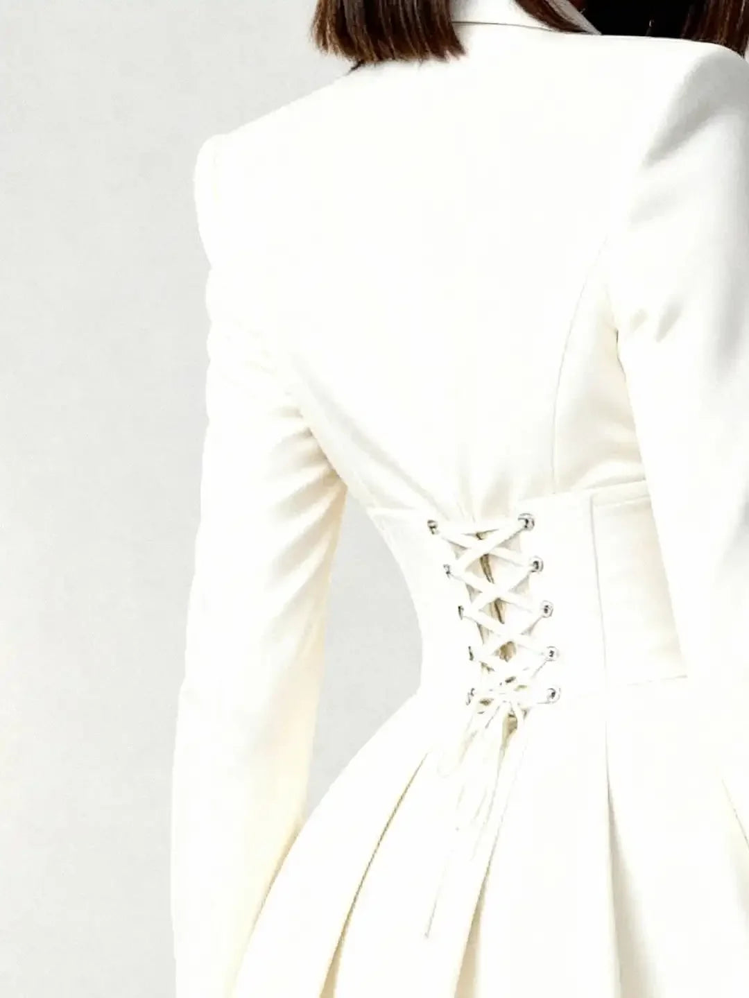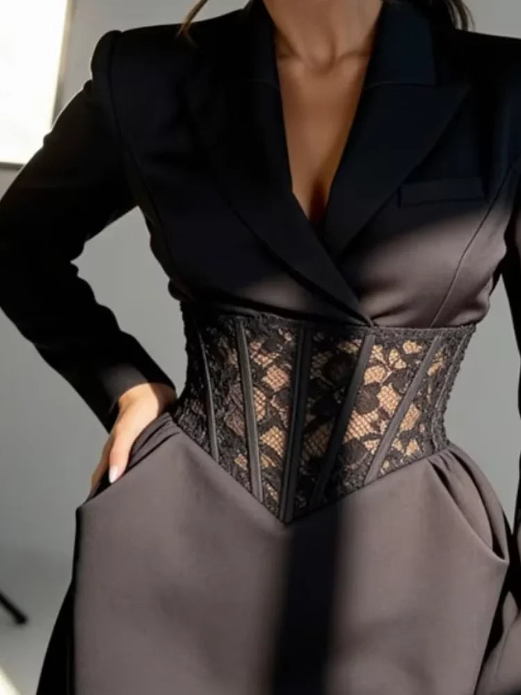 שמלת בלייזר קצרה בגזרה מחמיאה עם מחשוף וי ועיצוב פתחים עדין שמוסיף עניין וסטייל.