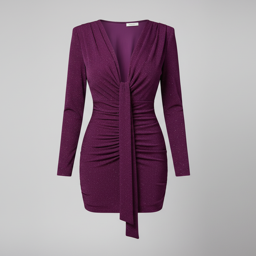שמלת מיני נוצצת עם מחשוף V עדין, שרוולים ארוכים וקישוטי פאייטים מרשימים. עשויה מבד פוליאסטר וספנדקס, מתאימה לערבים מיוחדים בעונת החורף.