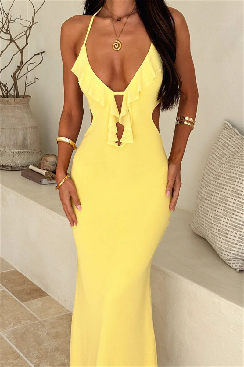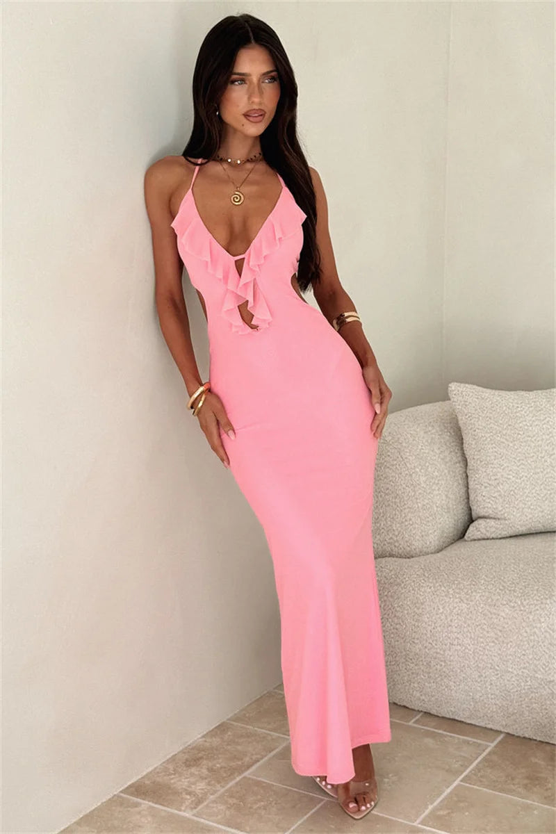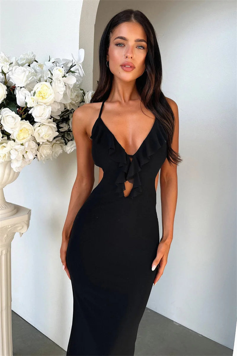 שמלת מקסי ארוכה בגזרה מחמיאה עם מחשוף וי וגב פתוח למראה אלגנטי ומרשים.