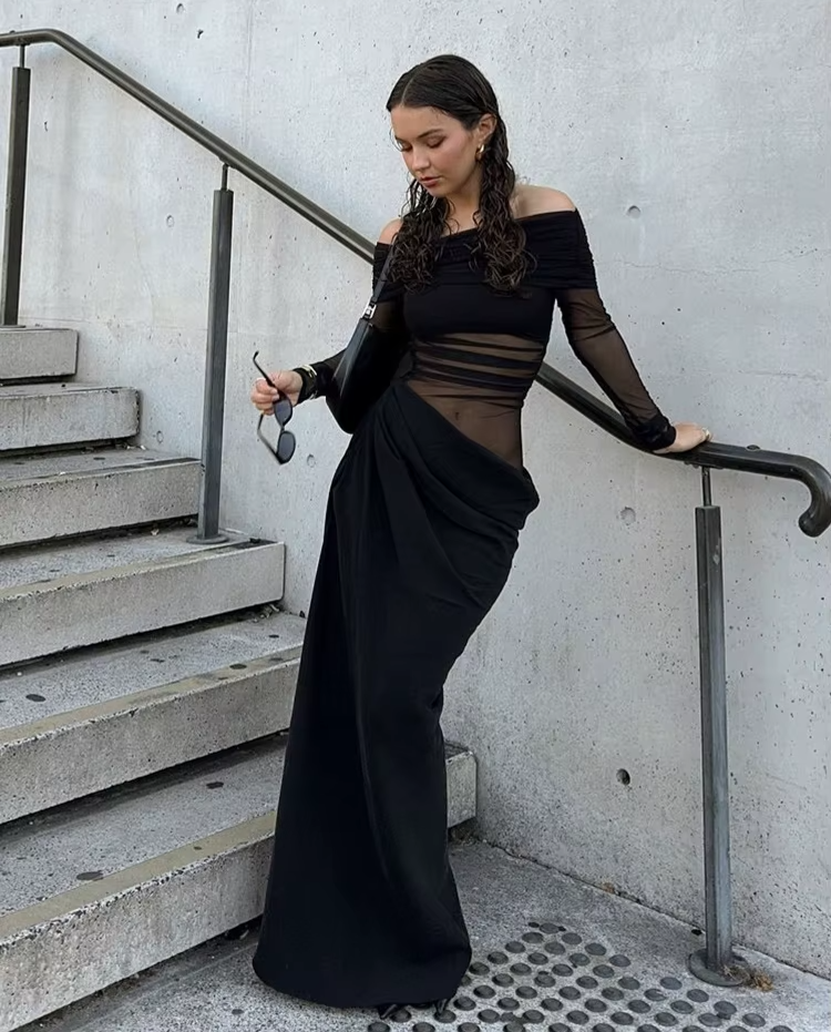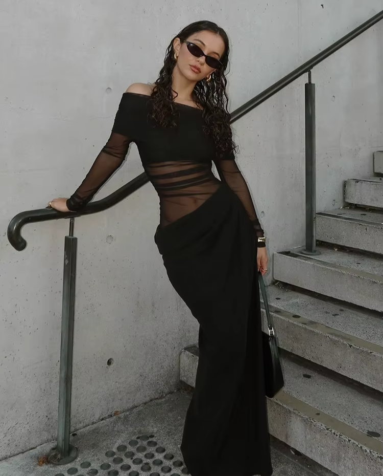שמלה ארוכה בגזרת עיפרון שמדגישה את קווי הגוף בצורה אלגנטית.