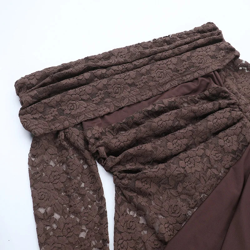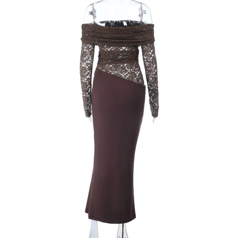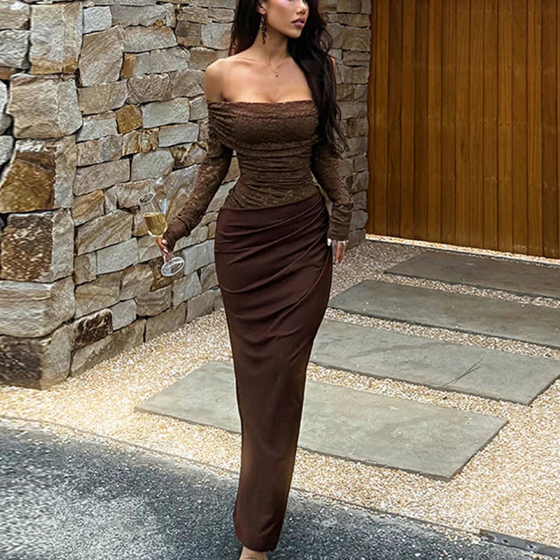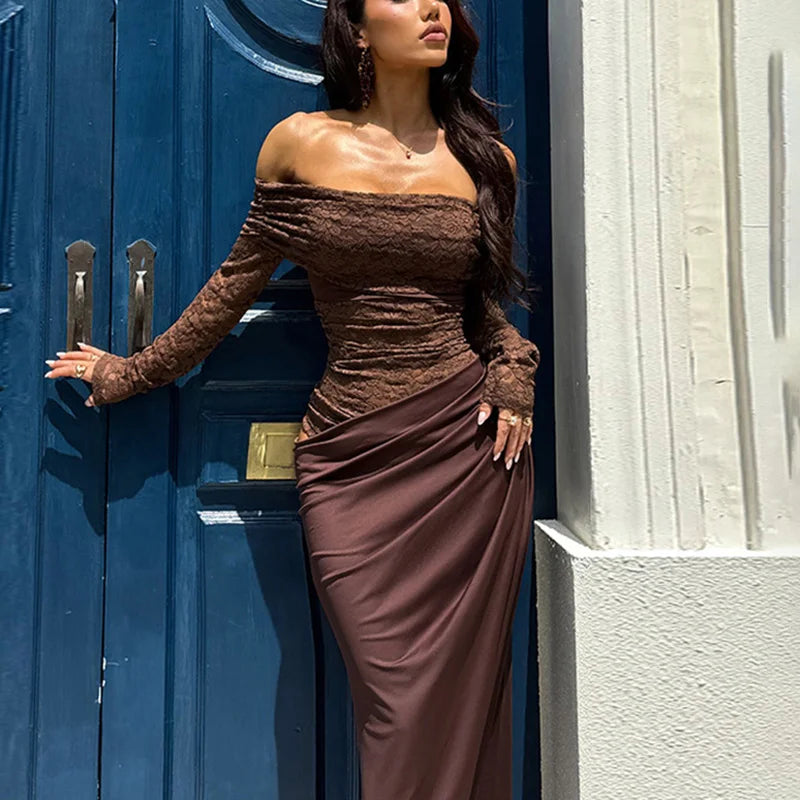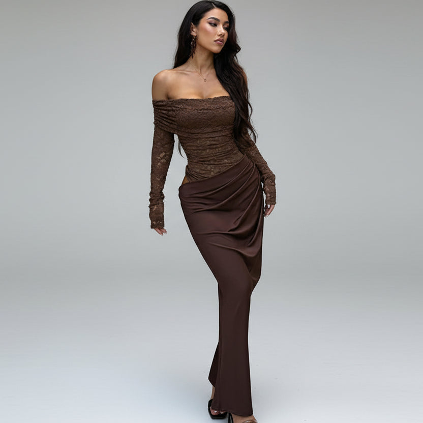 עיצוב כתף אלכסונית עם שילוב תחרה ושרוולים ארוכים יוצר מראה נשי ומרשים.