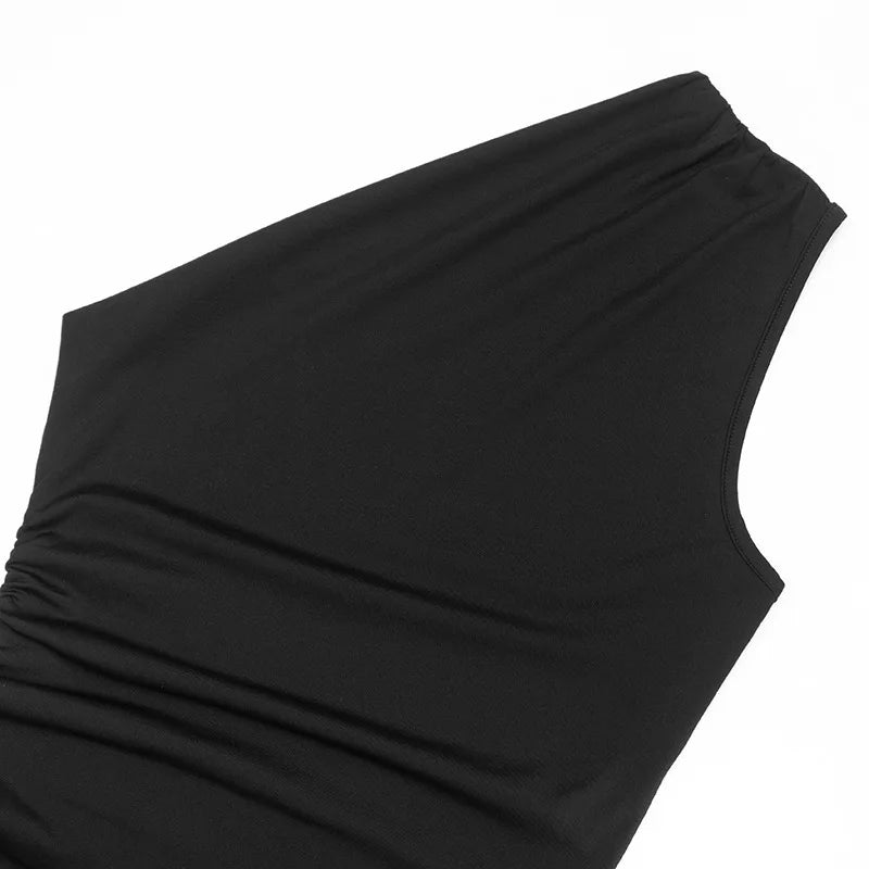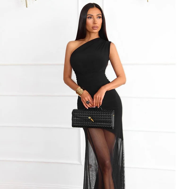 עיצוב עם כתף אלכסונית ושילוב בד שקוף יוצר מראה ייחודי ומעודכן.