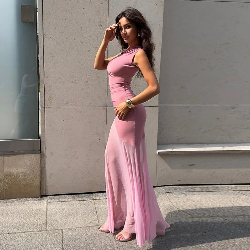 שמלת מקסי באורך מלא בגזרה מחמיאה וזורמת, המדגישה את קווי הגוף בצורה אלגנטית.