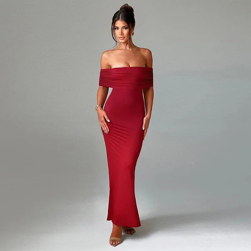 שמלת מקסי עם גזרה ישרה, צווארון סטרפלס וגב פתוח. עיצוב אלגנטי ומרשים, מושלמת למראה ערב ייחודי.