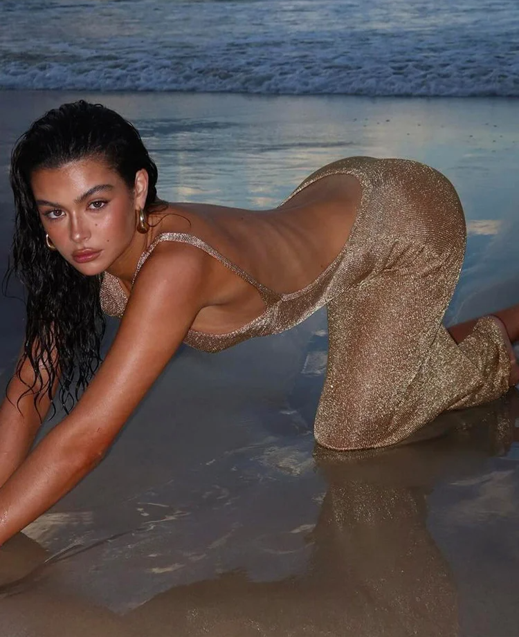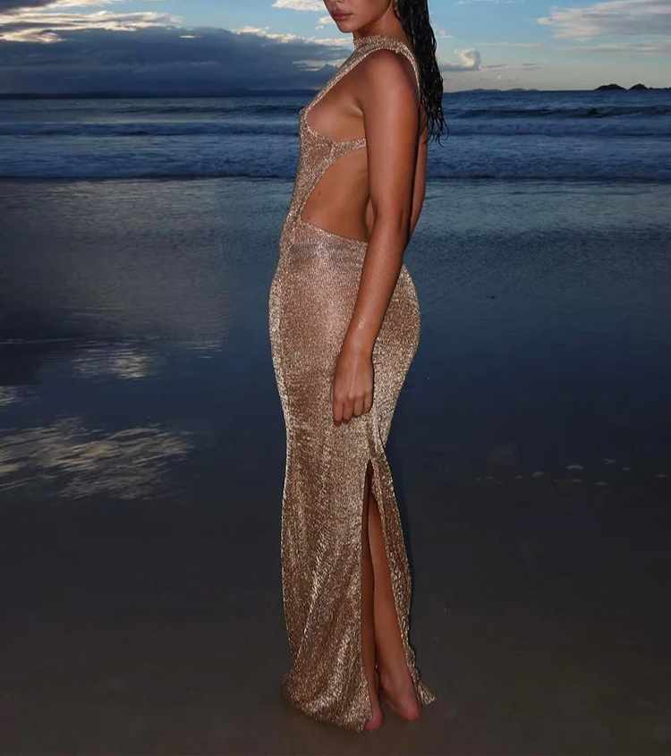שמלה ארוכה ומרשימה בגזרה צמודה שמדגישה את קווי הגוף, עם גב פתוח ועיצוב נקי ואלגנטי.