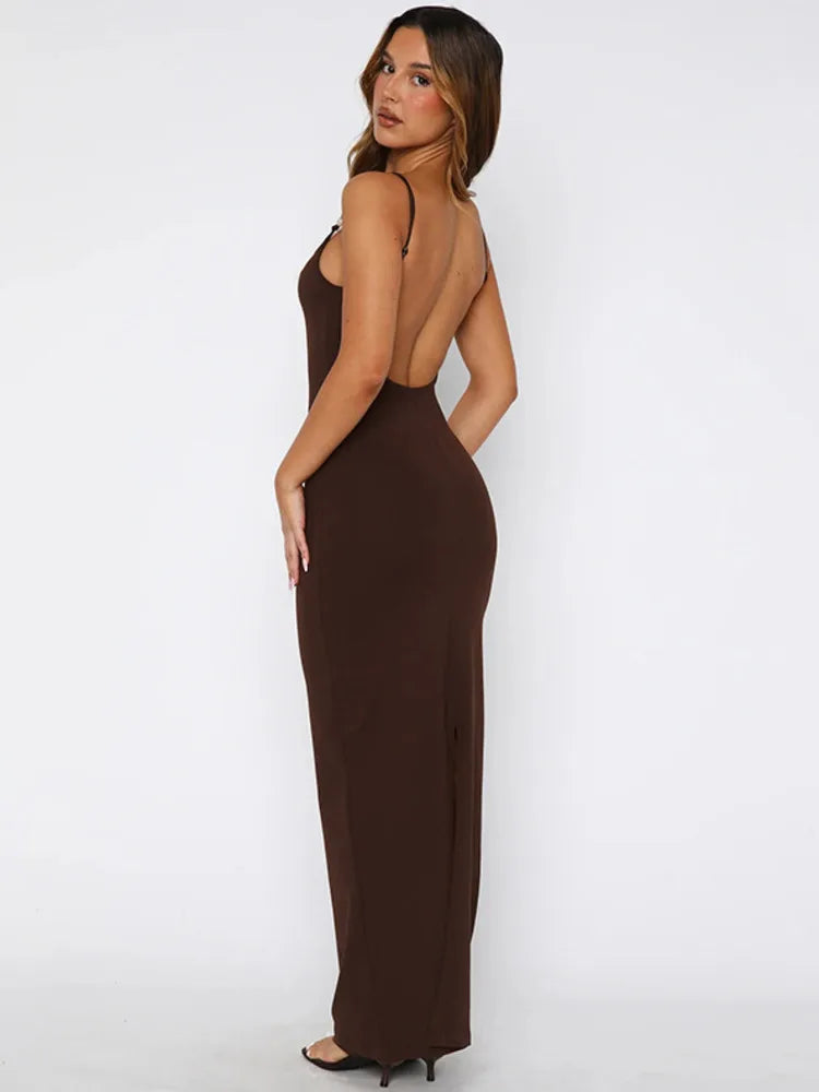 שמלה ארוכה עם כתפיות ספגטי, בגזרה צמודה ומשוחררת בקו A שמחמיאה לגוף ומעניקה מראה אלגנטי עם טאץ' חושני. עשויה מבד רך וגמיש, עם גב חשוף ומחשוף מחמיא שמוסיפים סטייל מושלם לכל יציאה.